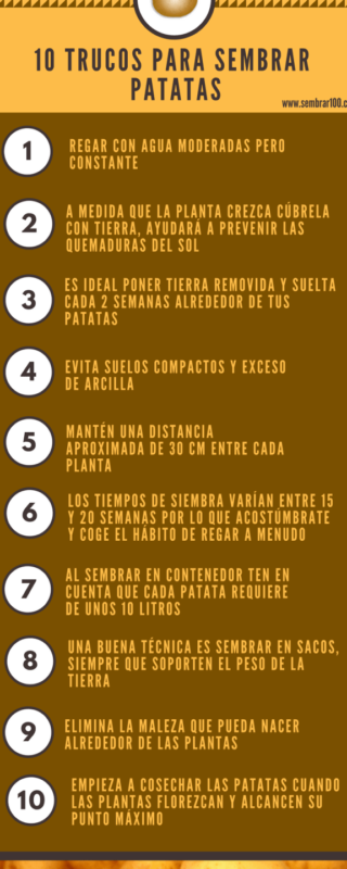 Recuerda que las patatas requieren un riego constante y un suelo húmedo pero no encharcado. Monitorea regularmente el nivel de humedad del suelo y ajústalo según sea necesario. Además, mantén el área libre de malezas para evitar la competencia por nutrientes.